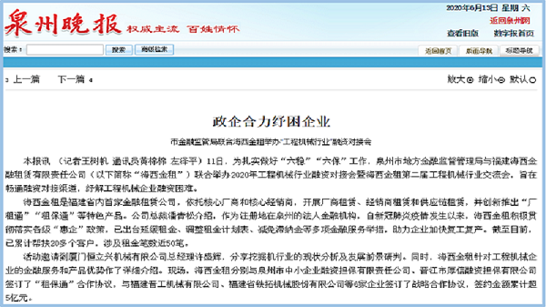 泉州晚報在6月13日綜合新聞版面刊發(fā)了《政企合力紓困企業(yè):市金融監(jiān)管局聯(lián)合海西金租舉辦“工程機械行業(yè)”融資對接會》。