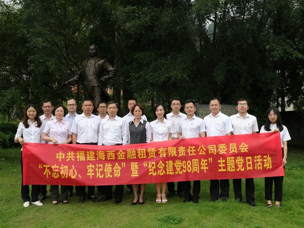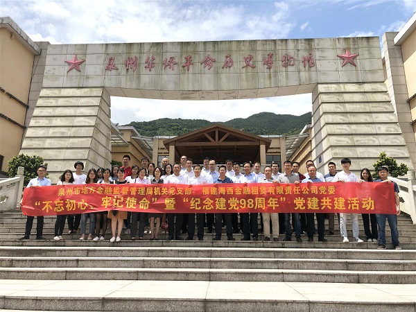 7月5日上午,海西金租黨委與黨建共建單位泉州市地方金融監(jiān)督管理局機(jī)關(guān)黨支部共同開展“不忘初心、牢記使命”暨“紀(jì)念建黨98周年”主題黨日活動,泉州市地方金融監(jiān)督管理局黨組書記、局長陳德慶,海西金租黨委書記、總裁潘青松,以及兩個(gè)單位黨員代表共計(jì)40余人一同前往南安市金淘鎮(zhèn)參觀泉州華僑革命歷史博物館和葉飛將軍故居。