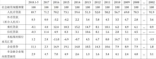 今年5月,社會(huì)融資規(guī)模增量為7608億元,比上年同期少3023億元。其中,委托貸款減少1570億元,同比多減1292億元;信托貸款減少904億元,同比多減2716億元;未貼現(xiàn)的銀行承兌匯票減少1741億元,同比多減496億元。也就是說(shuō),表外融資合計(jì)減少4215億,同比多減4504億元。這是造成5月當(dāng)月社會(huì)融資規(guī)模增量同比下降的最主要原因。從表2的社融增量結(jié)構(gòu)看,今年1-5月,委托貸款和信托貸款在社會(huì)融資規(guī)模增量中的占比則分別為-8.1%和-0.3%,未貼現(xiàn)的銀行承兌匯增量?jī)H占1.2%,分別較2017年末下降12.1、11.9和1.6個(gè)百分點(diǎn)。