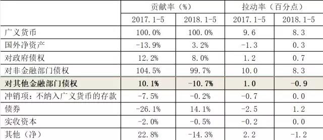 近一年多來(lái)M2增速大幅下降,主要是金融強(qiáng)監(jiān)管、減通道、去杠桿的結(jié)果,至今仍在持續(xù)。從各來(lái)源結(jié)構(gòu)對(duì)M2同比增速的貢獻(xiàn)率看,今年1-5月,M2各來(lái)源結(jié)構(gòu)中對(duì)其他金融部門債權(quán)的下降,導(dǎo)致M2增速較上年同期回落1.9個(gè)百分點(diǎn)。