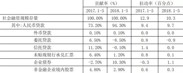 從社會(huì)融資規(guī)模增量結(jié)構(gòu)看,人民幣貸款在社會(huì)融資規(guī)模中的占比明顯回升,2018年1-5月為89.7%,比2017年全年水平高18.5個(gè)百分點(diǎn)。直接融資占比也有所上升,今年前5個(gè)月,企業(yè)債券和股票融資合計(jì)占社會(huì)融資規(guī)模的14%,較2017年全年水平提高7.2個(gè)百分點(diǎn)。